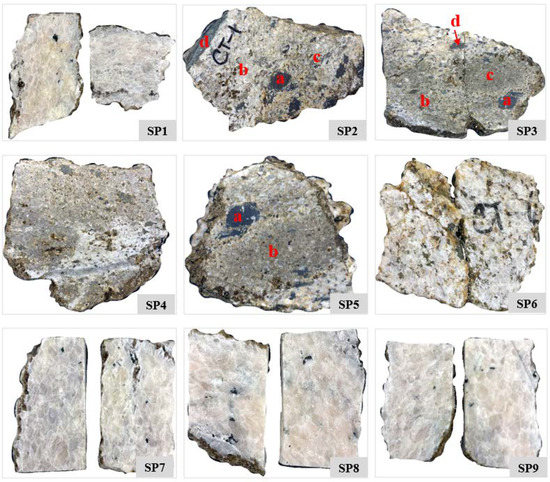 The Sillai Patti carbonatite samples collected from the field. The red-colored annotations on the samples SP2, SP3, and SP5 represent the points of the ASD spectroradiometer measurements for the spectral signatures. The spectra obtained at each of these points are shown in Figure 7.