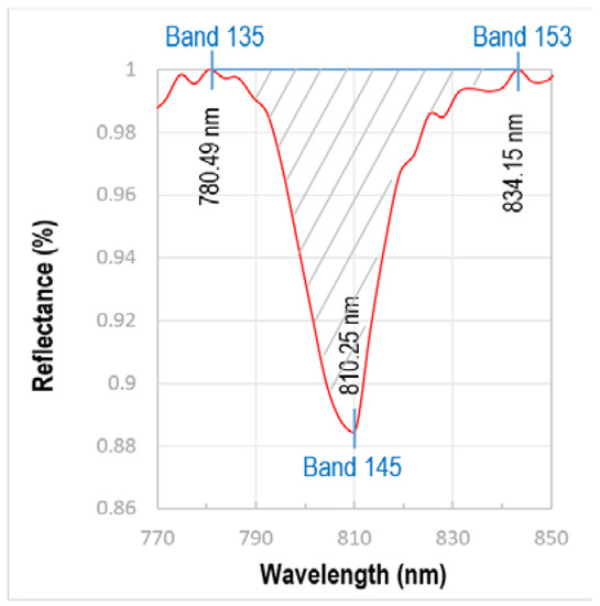 The area (the shaded part with oblique grey lines) of the absorption feature at wavelength 810.25 nm corresponds to the Nd concentration. The wavelengths 780.49 nm (band 135) and 834.15 nm (band 145) are taken as the shoulders of the Nd absorption feature.