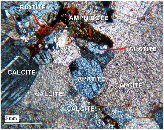 Petrographic results are found to be consistent with the earlier researchers, e.g., Mian [73], who divided the Sillai Patti carbonatite into biotite and amphibole sovites. In this area, both varieties of carbonatite contain 80–90% calcite, up to 6% apatite, and up to 7% iron oxide are present (Figure 6). Biotite and amphibole are present in both varieties in variable amounts. Biotite sovite has up to 7% biotite and relatively less iron oxide than amphibole sovite, which contains 50% amphibole and relatively more iron oxide. Both these varieties have trace amounts of phlogopite and pyrochlore. Amphibole sovite shows foliation as well in a few samples of ankeritic dolomite and dolomite.