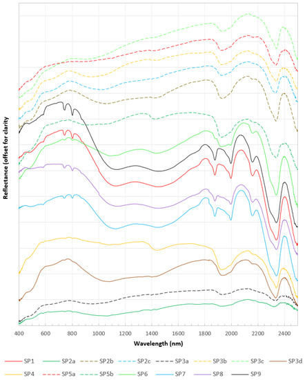 Four of the seven carbonate absorption bands common to the spectra of all anhydrous carbonate minerals are conspicuous in the ASD spectral profile of almost all the samples. The depth of these absorption features may vary, corresponding to the varying concentrations of the carbonate minerals. The most intense and distinguishing of these four absorption features is the one centered on 2340 nm, which shows the abundance of calcite mineral in the carbonatite samples. A broad valley centered at 1200 nm, giving the whole spectrum an “M-shape“, is attributed to Fe-rich calcite, e.g., in SP1, SP2b, SP3d, SP6, SP8, SP12, and SP13 [47,74,75]. The broad absorption feature between 900 and 1000 nm in SP2c, SP3a, SP3b, and SP3c is the diagnostic feature of goethite that may have formed by the alteration of magnetite or by the exsolution from Fe-rich carbonates [67,76].