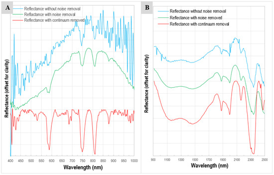 (A) The reflectance spectrum taken from the VNIR image of the SP7 sample. Noise-free VNIR spectra (green profile) are obtained through MNF rotation and FFT filter application applied on the noisy VNIR spectra (blue profile) that makes the noise-suppressed Nd absorption features prominent at 525, 587.5, 680, 745.91, 810.25 nm. Continuum-removed spectrum (red profile) shows the actual depth and the area of the Nd absorption feature at these absorption features. (B) The reflectance spectrum taken from the SWIR image of the same sample. No features of Sm, Pr, or Eu were observed in the SWIR part of the spectrum, however, the calcite absorption features are conspicuous. The valley between 1100 and 1500 nm is probably due to the Fe content.