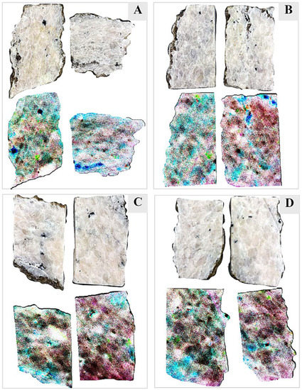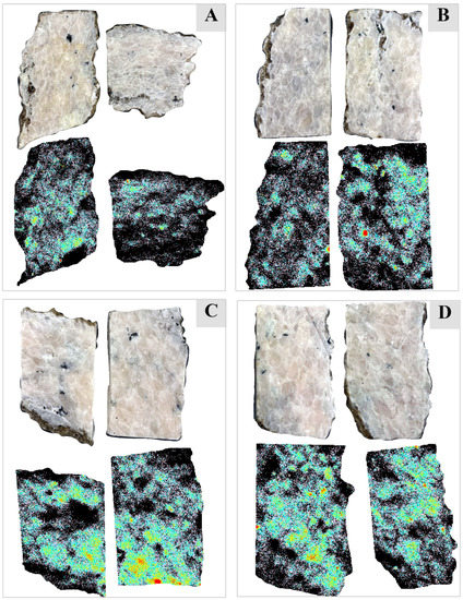 An RGB false-color composite of continuum-removed VNIR bands 69 (587.5 nm), 124 (747.91 nm), and 145 (810.25 nm). The darker the red tone of a pixel, the higher the concentration of Nd in the pixels of (A) sample SP1; (B) sample SP7; (C) sample SP8; (D) sample SP9.