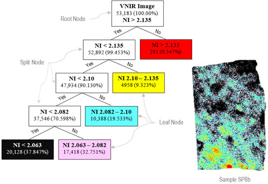 In the root node of the decision tree, which is composed of the whole image data, a threshold value of 2.135 for the NI is introduced. The same NI but with lower threshold values, e.g., 2.1, 2.082, and 2.063, are introduced in the subsequent split nodes. Based on these threshold values, the image data is recursively partitioned at each node producing the leaf nodes, each representing an Nd class label assigned to each threshold value. This framework is supposed to subdivide the hyperspectral image data into different classes based on the decision logic. Each class represents a group of pixels containing a specific Nd concentration. The delineation of the spatial distribution of Nd in the samples will be useful in analyzing the REE potential of Sillai Patti carbonatite.
