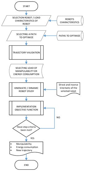 The flowchart shown in Figure 1 represents the sequence for the optimization of trajectories in any manipulator. This corresponds to specific created software in which the manipulator and trajectory to study are selected. With that, the software optimizes the performance and the electric energy of the manipulator. Notice that to obtain the corresponding results, it is necessary to study the kinematics and dynamics of the selected manipulator. Later, the objective function defined to select the weight for each of the optimization criteria (manipulability and electric energy) is implemented. Once the iterative algorithm obtains the results complying with the given unemployment conditions, it shows the results of both optimization criteria.