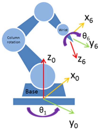 Direct kinematics refers to the position and orientation of the final effector. It uses the Denativ–Hartenberg convention. In addition, the same convention is used to find the inverse kinematics of the robot. In this case, the inverse kinematics can be solved by geometrical methods [46]. It is solved in two steps because, in manipulators with spherical wrists, the movement of the three last links does not change the position of the center of the manipulator’s wrist. The orientation and position of the end of the gun with regard to the base of the robot are known. Hence,