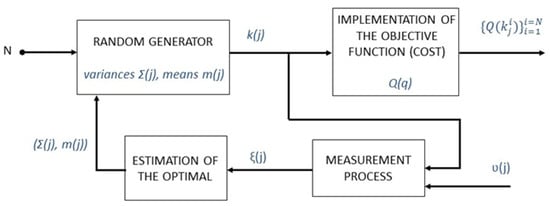 The random generator is applied to the cost function. The described algorithm modifies the vector of averages and the matrix of variances of the generator until a solution of the desired quality is obtained. A measurement process followed by an estimator is introduced to achieve the desirable estimation of the optimum. For this, the average of the candidates that best represents the optimum is calculated. So, it should be: