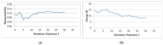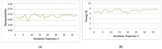 The behavior of the manipulability factor and electric energy optimization algorithm for Trajectory 3 is presented in Figure 13a,b. The algorithm is stabilized in iteration 38, as can be seen in both figures.