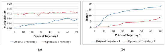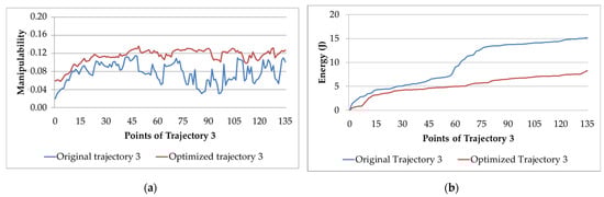 Original and optimized Trajectory 3: (a) manipulability; (b) electric energy consumption.