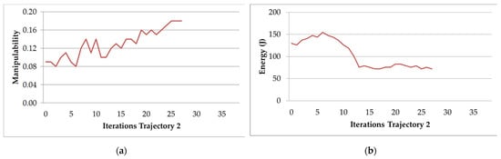 Figure 12a,b present the graphs of manipulability and electric energy that are obtained with the original Trajectory 2 with its respective optimized trajectory.