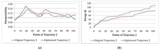 Original and optimized Trajectory 2: (a) manipulability; (b) electric energy consumption.