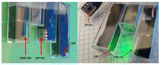 (c) Endpoint detector system: A simple colorimeter was developed based on a RGB LED light source [30], coupled with two kinds of light detectors: a photo resistor LDR [31] and a photodiode OPT101 [32]. The endpoint detector system allows for a limited selection of wavelengths, centered close to the three maxima for the RGB light (460 nm for blue, 520 nm for green, and 630 nm for red) to obtain the maximum sensitivity depending on the color developed in the solution. Better sensitivity is achieved when the color for the RGB illumination and the indicator color are nearly complementary. The intensity of the light emitter color is controlled by using three microcontroller PWM digital pins. In our case, a single color of the RGB LED was turned on, taking into account the color emitted by the chemical indicator used. The electrical signal activating the emitter can be set easily, and the change in the light intensity reaching the detector has to be scaled and adjusted to maximize the voltage change.
