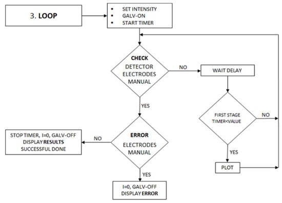 The next step, which is also performed only once, initially configures the default values of the variables and establishes the serial port communication. The resistance between the electrodes is checked to verify that its value is low. Thus, the galvanostat is momentarily switched ON using a very low current value. Simultaneously, the voltage developed between the electrodes is read, and if the value is higher than the one previously specified, the program ends, indicating that there is an error in the electrical connection. The experimental variables are then read from the Excel sheet using the PLX_DAQ serial communication add-on and are checked for compliance with the appropriate ranges set previously. Thus, the current input value entered in the spreadsheet has to be a value within the selected sensitivity range manually selected using the PCB prototype galvanostat [23]. The process of verification ends when all requirements for the variables are satisfied: sensitivity, actual current value, RGB LED brightness, and timing parameters.