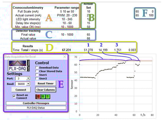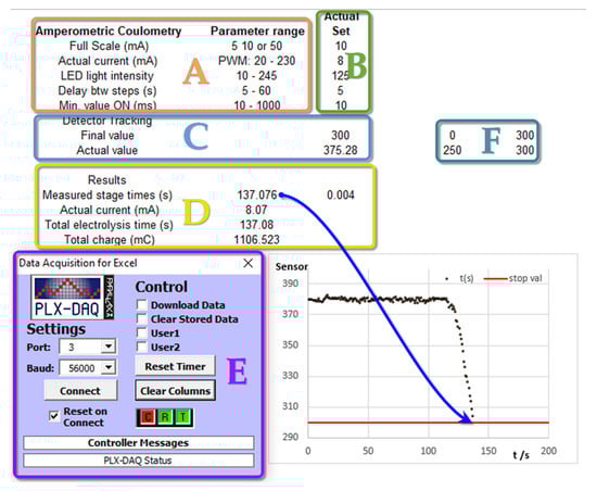 Figure 4 shows a screenshot of the spreadsheet interface for a simulated measurement process using LDR as the light detector and a resistor as the dummy electrochemical cell. Initially, the parameters to be used in the experiment are set in section B, as indicated in Figure 4. These are checked against the accepted range (section A). If there are no errors, the sensor level for the titration endpoint is set (section C). For the LDR light sensor case, during the titration process, the sensor value increases. Thus, the endpoint selected must be a greater value than that of the starting point (this requirement is checked by the software). For this purpose, two potentiometers (R4 and R5 shown in Figure 1) were operated. The plot in the screenshot (Figure 4) shows the evolution of the detector signal during the progress of the simulated titration. For these dummy tests, serial communication was not inhibited, allowing for various stages to be plotted, which are labeled by the numbers 1, 2, and 3 in section D. The horizontal red line indicates the limit value of the endpoint sensor. Further details on the measuring operation can be found in the Supplementary Materials.