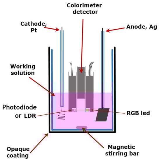 In this way, the colorimeter detector assembly can be easily immersed in the cell solution, keeping the distance and position of both the detector and emitter fixed. When the solution under analysis started to develop a change in color due to the excess electrochemically-generated reactant interacting with the chemical indicator, the intensity of light reaching the light sensor decreased and the output voltage changed. When the LDR detector was employed, the output voltage increased, while it decreased when the photodiode (OPT101) was used. The electrolysis process continued until the output voltage reached a preset value. The color of the solution was kept uniform by using a magnetic stirrer (Stuart CB162).