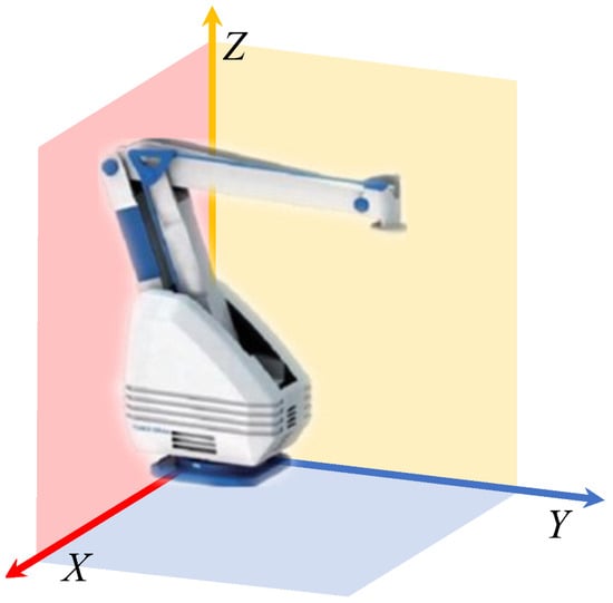 The coordinate system of the palletizing robot is shown in Figure 1. The coordinate system takes the rotation center of the bottom fixed base as the origin. The big arm and the small arm are located in the vertical plane composed of X axis and Y axis. By changing the angle of the driving motor in this plane, the coordinate change of the palletizing robot execution end in a certain range in the vertical plane can be realized. The x-axis and z-axis constitute the horizontal plane in the coordinate system. Through the rotation of the waist, the coordinate change of the palletizing robot executive end in the horizontal plane is realized. Three servo motors realize the change of the actual position of the palletizing robot in the spatial coordinate system.