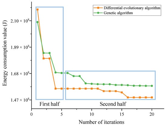 Figure 8 is the optimal curve comparison diagram of genetic algorithm and differential evolution algorithm. In Figure 8, in the first half of the curve, before the fifth iteration, it can be clearly seen that the convergence rate of the differential evolution algorithm is significantly greater than that of the genetic algorithm after the third iteration. After the fourth iteration of the energy consumption value, differential evolution algorithm and genetic algorithm have pulled a certain distance. In the first half of the curve, the convergence rate of the differential evolution algorithm is faster than the genetic optimization algorithm in a short time. Additionally, the curve of the latter half of the observation, genetic algorithm in the fifth iteration to the twentieth iteration, energy consumption values still have a significant decline. The numerical decline of the differential evolution algorithm in the second half is not large. It can be seen that the differential evolution algorithm does not only converges fast at the initial time, but also quickly obtains the required global extremum, which has obvious advantages compared with the genetic algorithm.