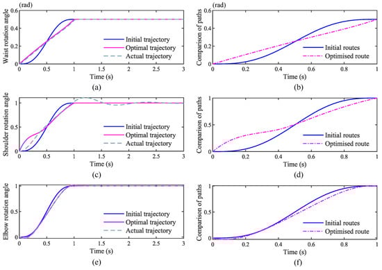 In Figure 9a,c,e the optimal trajectory is the trajectory parameters of the initial trajectory optimized by the planner. The actual trajectory is the trajectory profile of the optimal trajectory tracked by the proportional-derivative control algorithm. In Figure 9b,d,f the initial routes are the initial trajectory parameters collected by the bionic trajectory designed in the paper. The optimized routes are the path operation parameters with the lowest energy consumption at the waist, shoulder and elbow after optimization by the energy optimization algorithm.