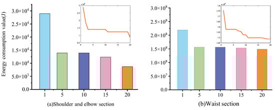 In Figure 10b, the value of the objective function based on the waist dynamics equation of the robot arm decreases with the increase in the number of optimizations. The value of the objective function reaches a relatively stable condition after the 10th optimization. From the line graph, the energy consumption of the optimal trajectory has a large reduction after optimization. Thus, a significant reduction in waist motion energy consumption can be attributed to the trajectory planner.
