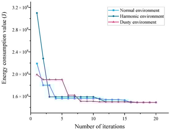 As power industrial robots, palletizing robots are often used in handling large materials, most of which produce large amounts of dust during handling. In the dusty environment, the viscous friction coefficient in the joint motor joint of the manipulator is mainly changed. The more serious the dust environment is, the greater the operating resistance will be, which increases the energy consumption and changes the parameters of the model. In Figure 11, the parameters of the energy consumption model change when working in dusty conditions, and the speed of energy optimization decreases compared with normal operation. However, as the number of iterations increases, it remains stable at the same value as normal. The energy optimization rate decreases compared with the normal operation; however, with the increasing number of iterations, it can still be stabilized at the same value as the normal case.