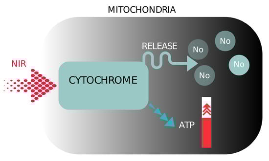 Photobiomodulation (PBM) refers to the therapeutic use of red or near-infrared light to stimulate inflammation, relieve pain, promote healing, and prevent tissue death []. The photons of a certain energy or the light of a certain wavelength are able to stimulate a photochemical reaction by being absorbed by the photoaccepting chemical substances in the cell []. Different wavelengths can be used, but red and near-infrared (NIR) light with wavelengths from 600 to 1100 nm are most commonly used because of their greater penetration depth. With red and NIR light, the photoacceptor is cytochrome c oxidase, an enzyme in mitochondria involved in the fourth phase of the mitochondrial respiratory chain [,]. When PBM is used with red and NIR light, mitochondria in cells produce more ATP (Anti-inflammatroy process), which consequently leads to more energy for the cell. In addition, PBM produces reactive oxygen species, which play an important role in cell healing, signaling, and stimulation of gene transcription by transcription factors and nuclear factors [,]. Another benefit of PBM is the release of nitric oxide from the mitochondria, allowing more oxygen to take its place and generate more energy [], see Figure 1.
