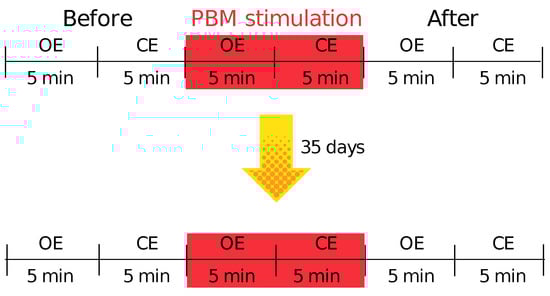 The measurement protocol consisted of the following parts: 10 minutes of EEG signal recording before stimulation (measurement interval marked “Before”) in two conditions with eyes open (OE) and eyes closed (CE) for 5 minutes each. Then EEG signals were recorded during photobiomodulation (measurement interval marked with “Stimulation”) and 10 minutes after photobiomodulation treatment (measurement interval marked with “After”). A schematic representation of the study design can be found in Figure 4.