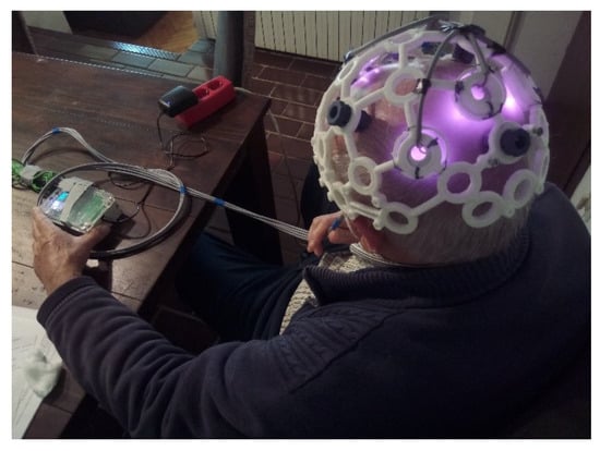 The prototype tests were performed on one subject: an elderly person (84 years old). Before starting the experiment, the subject was tested with the SAGE test. SAGE is a short questionnaire for self-assessment of cognitive status with the aim of detecting mild cognitive impairment (MCI) and early signs of dementia. The questionnaire takes an average of 15 minutes to complete. The maximum score is 22, and a score of 17 and above is considered normal (individuals with this score are within the normal range). Individuals with scores of 15 and 16 most likely suffering from a milder memory or thinking disorder. Individuals with a score of 14 or less are most likely to suffer from a more severe memory or thinking disorder []. In the first test with the questionnaire SAGE, the subject scored 16. See Figure 5 for the treatment of PBM stimulation.
