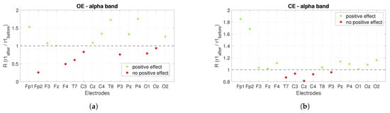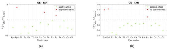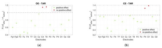 Figure 10 shows the long-term effects of PBM stimulation using TAR. The ratios of TAR shown in Figure 10 are calculated between the r2 after stimulation and the r1 before stimulation. Figure 10a shows the observed ratios during the OE condition and the positive effect is seen at thirteen of sixteen electrodes, while Figure 10b shows the observed ratios during the CE condition and the positive effect is seen at fourteen of sixteen electrodes.