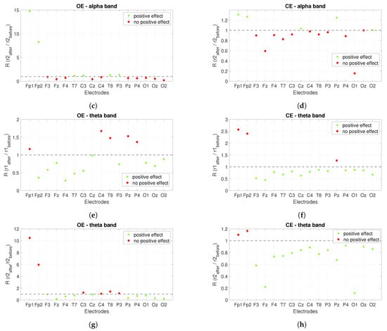 For the r1, the power ratios for the alpha band under the condition OE, showed that there was a visible increase at nine of sixteen electrodes shortly after stimulation (see Figure 7a), and under the condition CE at eleven of sixteen electrodes, see Figure 7b. In the r2, the positive effect is visible at six of sixteen electrodes for OE (Figure 7c) and at five of sixteen electrodes for CE, see Figure 7d. Figure 7e plots the ratio of power in the theta band for the OE condition in the r1. The positive effect is visible on eleven of sixteen electrodes, while for the CE condition the positive effect is visible on thirteen of sixteen electrodes, see Figure 7f. For the r2 in the OE condition (Figure 7g), the positive effect is visible on ten of sixteen electrodes and for the CE condition, the positive effect is visible on fourteen of sixteen electrodes (Figure 7h).