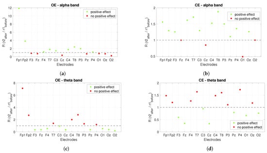 The power ratios between the r2 after stimulation and the r1 before stimulation show us the long-term effect of PBM stimulation, see Figure 8. Similar to Figure 7, a ratio greater than one is expected for the alpha band and the opposite (less than one) for the theta band. The green squares mark satisfactory ratios, while the red circles mark ratios that are not satisfactory. Figure 8a shows the power ratios for the alpha band under the OE condition and the positive effect is founded in nine out of sixteen electrodes, while Figure 8b shows the ratios for the alpha band under the CE condition and the positive effect is visible in twelve out of sixteen electrodes. The power ratios for the theta band are shown in Figure 8c,d. Figure 8c shows the ratios for the OE condition and the positive effect is seen at nine of sixteen electrodes, while for the CE condition the positive effect is seen at seven of sixteen electrodes, see Figure 8d.