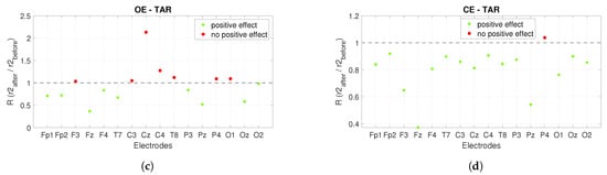 Figure 9 shows the short-term effect of PBM stimulation using TAR. Figure 9a shows the ratios of TAR between the r1 after and before stimulation under the OE condition and Figure 9b under the CE condition. The positive effect of PBM stimulation is visible at thirteen of sixteen electrodes for the conditions OE and for CE. Figure 9c shows the ratios of TAR between the r2 after and before stimulation under OE and Figure 9d under CE. Under the OE condition, a positive effect is detected at nine of sixteen electrodes, whereas under the CE condition, the positive effect is seen at fifteen of sixteen electrodes.