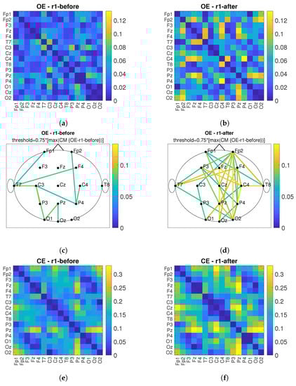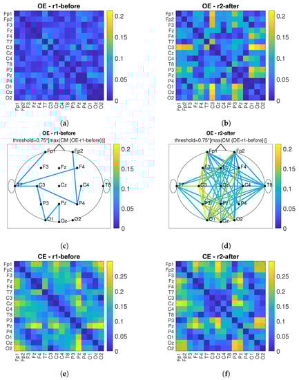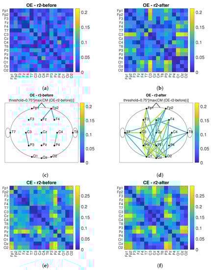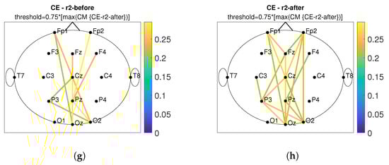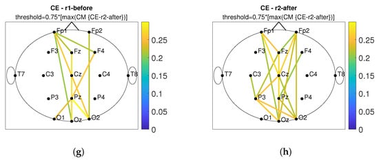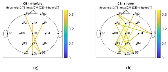 According to [], connectivity between near and far electrodes for the alpha band decreases in different types of dementia. Therefore, the goal of PBM stimulation is to increase the number of connections and connectivity values between the observed electrodes after PBM stimulation. Figure 11 shows the connectivity matrices (CM) and the head plot of the connections above threshold between pairs of electrodes for the conditions OE and CE and before/after stimulation. First, the maximum value of the compared CMs before and after is determined and the matrix with the lower maximum value is used as the reference matrix. The threshold was set at of the maximum value of the reference matrix. All connections above the threshold are shown in the head plots. The short-term effect is observed and the comparison before and after stimulation is performed for the r1, see Figure 11. By comparing Figure 11a,c with Figure 11b,d, it can be observed that the values of connections between electrode pairs are higher after PBM stimulation and that the number of electrode pairs increases. The same conclusion is obtained when considering the CE condition, which is shown in Figure 11e,g (before stimulation) and Figure 11f,h (after stimulation). Figure 12 shows the short-term effect of PBM stimulation for the r2. For the conditions of OE (Figure 12a–d), it was found that the connection between different brain regions increased more after stimulation compared with CE (Figure 12e–h). Figure 13 shows the long-term effects of PBM stimulation. A comparison of connectivity between the r1 before stimulation and the r2 after stimulation for the OE (Figure 13a–d) and CE (Figure 13e–h) conditions is shown. Higher values of the connection between the electrodes are visible.