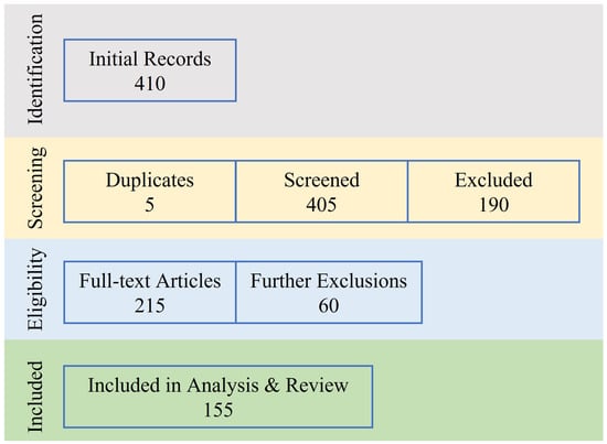 The approach which we considered for search through the database looked for terms that comprised of different word combinations describing the problem at hand. The terms “Functional Encryption”; “Attribute based Encryption”, “Identity based Encryption”, “Searchable Encryption” and “Predicate Encryption” were used in combination with terms relating to “Internet of Things” and underlying applications. Once the articles that resulted from the search were extracted, a manual review of all the results was performed through focusing on the title, abstract, keywords and main text of the papers, eliminating any works that were deemed unrelated to the purpose at hand. Any duplicate results were also eliminated at this stage. It should be noted here that any articles that discussed the aforementioned variations of fine-grained access control in mathematical detail but did not address specific IoT applications were also excluded from further analysis. More specifically, the articles considered for further analysis met the criteria as (i) they considered fine-grained access control in one of the variations given above; and (ii) they presented application of access control in an application area of IoT. Further screening was also applied to those records that did not offer full-text availability and were deemed unsuitable for inclusion in the review due to the fact they were not applicable in IoT areas. We summarize the process of search, exclusion, and selection in Figure 2, where it can be seen that although the initial search resulted in a total of 410 articles, the number was reduced to 155 articles after the analysis, filtering, and classification. We also provided a distribution of the works considered in this study according to the publication year in Figure 3.