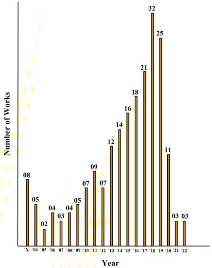 The number of works considered in this work, shown according to the publication year. ‘X represents year 2003 and earlier.
