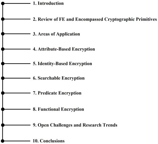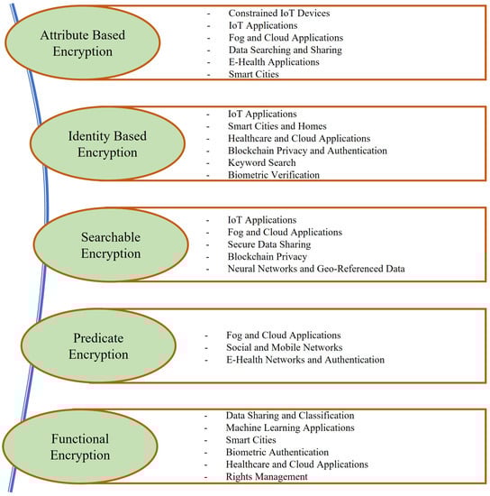 The basics of considered cryptographic primitives and early development works are described in Section 2.1, Section 2.2, Section 2.3, Section 2.4 and Section 2.5, whereas Section 3 gives a brief description of the considered application areas. The different applications that we cover in this work range from IoT and cloud applications to data sharing and classification and machine learning. The presented work is divided into sections pertaining to different techniques, wherein Section 4 considers the applications of ABE; Section 5 describes the work utilizing IBE for the most common application areas; Section 6 presents the works using SE; Section 7 describes the applications of PE; and the applications wherein FE is utilized are given in Section 8. We provide some open challenges and related research trends in Section 9, and finally, some conclusions are drawn in Section 10. A graphical outline of this work is also shown in Figure 4. We also note that there is a significant overlap in the application areas of all these cryptographic techniques, whereas the underlying schemes and targeted benefit drawn upon differ greatly depending on the utilization of these schemes.