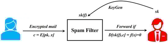 For further illustration, we consider the common example of spam filtering on encrypted mail, as described in [44] and depicted in Figure 5. Here, the email recipient, who has a master secret key , gives a spam-filtering service a key for the functionality f; this f satisfies whenever message x is marked as spam by a specific spam predicate, otherwise . A sender encrypts an email message x to the recipient, but the spam filter blocks the message if it is spam. The spam filter does its job through the key but learns nothing else about the contents of the message.