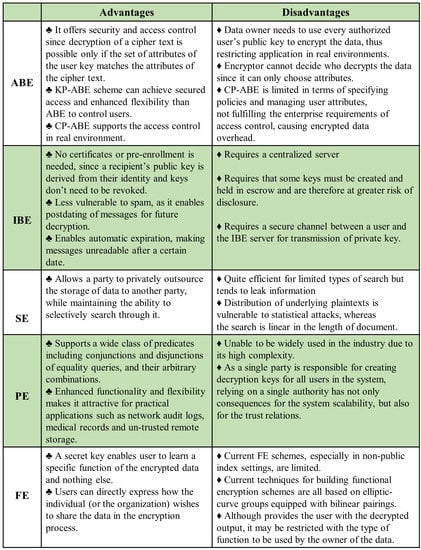 Wang et al. [12] provided a survey on the two main techniques of searchable encryption (SE), namely symmetric SE (SSE) and public key encryption with keyword search (PEKS). Different SE schemes are categorized and compared in terms of functionality, efficiency, and security. The work of [13] describes the notion of SE in the context of healthcare applications and characterizes the SE use cases into different healthcare scenarios. The authors provided a comprehensive overview of the four representative SE techniques: SSE, PEKS, attribute-based encryption with keyword search (ABKS), and proxy re-encryption with keyword search (PRES) according to different electronic health records (EHRs) retrieving scenarios and requirements. Furthermore, the categorization and comparison of different SE schemes in terms of their security, efficiency, and functionality is also provided. In a more recent work, the authors in [14] presented a complete taxonomy/classification of the searchable encryption schemes in terms of the type of search, type of index, results retrieved, implementation type, multiplicity of users, and the techniques used. A more recent study in [15] provided the reader with a wide view of the different FE schemes, focusing on their functionalities, limitations, security models, and the involved mathematical assumptions. The authors also presented an overview of “non-standard” FE schemes that go beyond the inner product encryption and schemes with enhanced properties.