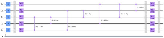 QAOA is a variational quantum algorithm (quantum–classical hybrid algorithm) due to its implementation through quantum circuits that depend on a set of variational parameters (, ). It was introduced by Farhi and Goldstone in 2014 [11] to solve the problem of finding out a cut whose size was at least the size of any other cut (MaxCut) on a regular graph. This algorithm is characterized by a lower bound for the ratio between the result obtained by the algorithm and the optimal cost (the “approximation ratio”) and depends on an integer . The quality of the approximation improves as is increased, and the depth of the quantum circuit grows linearly times the number of constraints. In fact, in [11], QAOA always found a cut that was at least 0.6924 times the size of the optimal cut.