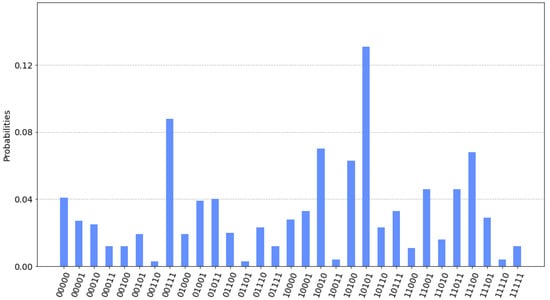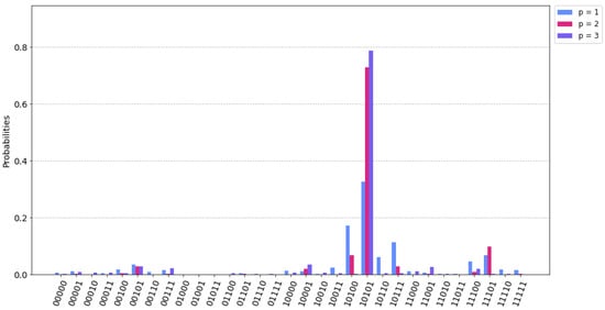 Additionally, to test how the algorithm performs according to the number of QAOA layers, simulations with 500 shots were executed and . The theoretical accuracy provided by QAOA improves with higher values of as was already anticipated in Section 2.1. Figure 5 illustrates how the probability of obtaining the right solution increases with higher values of . However, it turns out that for implementation on a real device, this improvement is not remarkable because the depth of the quantum circuit has a negative impact on the noise level.