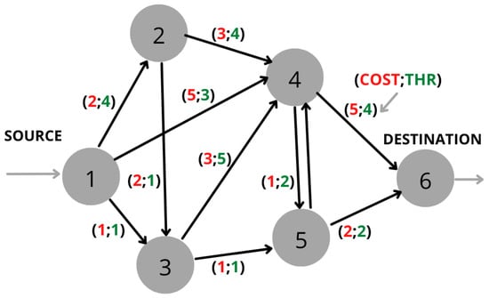 Since communication networks consist of nodes and links; one of the main objectives is to find the minimum cost (in terms of battery consumption) to transmit the traffic from an origin node to a destination node. A network is represented by a graph , where V is the set of vertices (nodes), E is the set of links (weights), and the link from node i to node j is expressed as . Figure 2 shows an example of a network. If node 1 is the source node and node 4 is the destination node, then the problem consists of finding the shortest path from node 1 to node 4 depending on the requirements, constraints, and/or objectives.