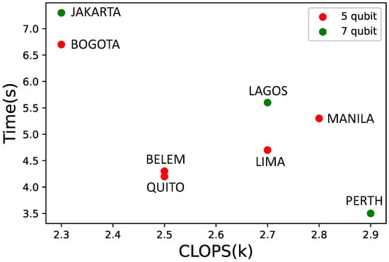 In the last few years, quantum computers have entered a new phase, where qubit noise was more considered and could benefit from error correction techniques. Quantum volume (QV) has turned into an important parameter apart from the qubit number since quantum computer developers considered that it was also important to have well-calibrated controlled noise qubits rather than ti have a huge number of noisy qubits. QV measures the performance of gate-based quantum computers [21]. Therefore, to achieve supremacy, it is necessary to have a higher number of qubits that are well-calibrated. Another crucial metric to measure quantum device performances were introduced by IBM recently. CLOPS (circuit layer operations per second) corresponds to the number of quantum circuits a quantum processing unit (QPU) can execute per unit of time. In this regard, and according to the available systems (ibm_perth, ibm_lagos, ibm_jakarta with seven qubits; ibm_manila, ibm_bogota, ibm_quito, ibm_belem, and ibm_lima with five qubits), a representation of CLOPS vs time is presented in Figure 7.