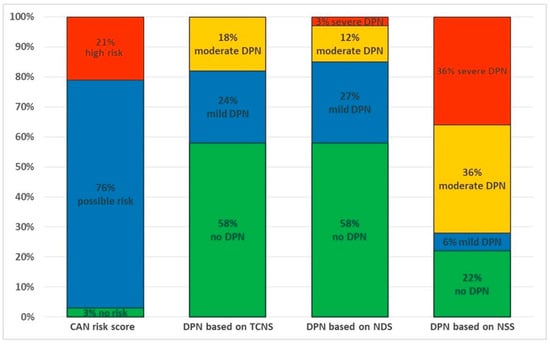 CAN risk score estimated by SUDOSCAN and DPN based on TCNS, NDS and NSS. Abbreviations: CAN—cardiac autonomic neuropathy, DPN—diabetic peripheral neuropathy, TCNS—Toronto Clinical Neuropathy Score, NDS—Neuropathy Disability Score, NSS—Neuropathy Symptom Score.