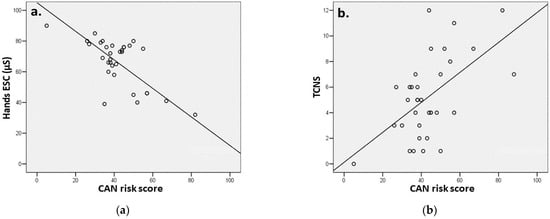 Correlations between the SUDOSCAN CAN risk, hand ESC (a) and TCNS (b). Abbreviations: CAN—cardiac autonomic neuropathy, ESC—electrochemical sweat conductance, TCNS—Toronto Clinical Neuropathy Score.
