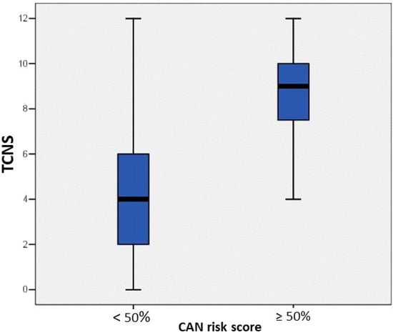TCNS was significantly higher in the case of patients found at high risk, compared to those at low or no risk for CAN (p = 0.001) (Figure 4).