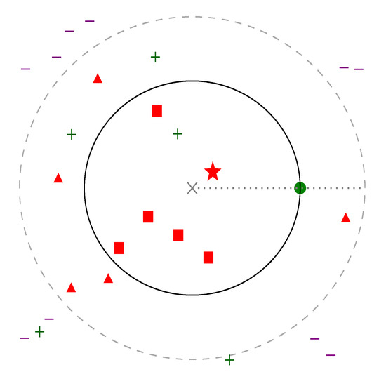 Two-dimensional representation of the embedded space. Gray cross in the middle marks the anchor element, a, and a green point shows a positive pair, p. positive distance is therefore defined and represented as a circle around a. Marginal distance () is similarly shown as a dashed circle. The closest negative sample, which provides the highest loss, is represented with a star; other elements where are shown with squares, and triangles represent negatives where . Other positive and negative data points are represented with plus and minus signs, respectively.