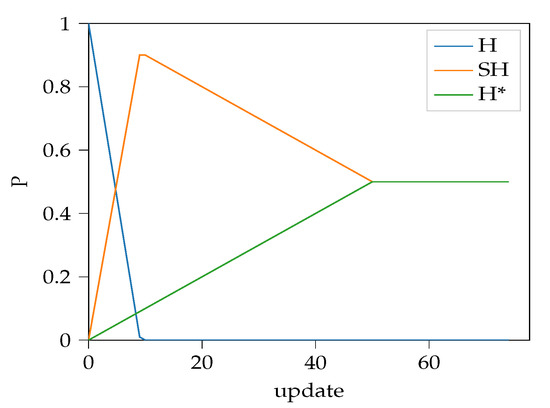 The algorithm increases the probability of semi-hard and hardest mining until , afterwards monotonically increases while starts to decrease. A sample is shown on Figure 3.