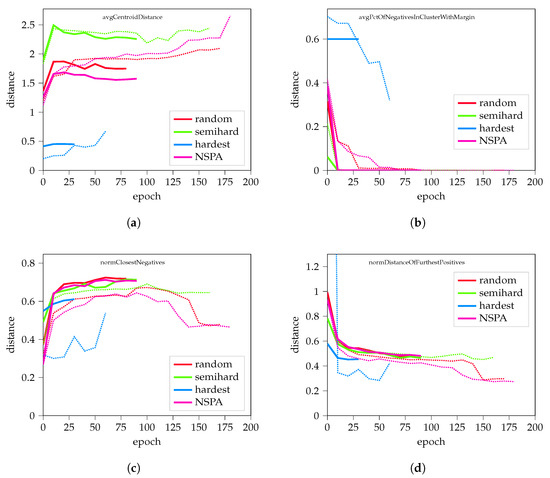 Furthermore, the trainings showed that correlation was visible between the average distance between all elements, the average distance between the estimated centroids, and the average distance between the closest negatives. Similar behavior was observable in cases of calculating the average radius of clusters, the average distance of furthest positives, and the average distance between all positive pairs.