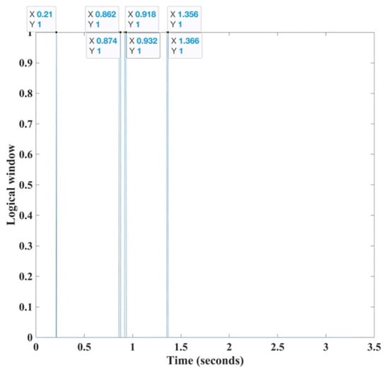 The outlier detection window (applied to trace 45 of Yilmaz shot record 23) is a logical array of ones and zeros. The first outlier (at time 0.21 s) is noise as it is a window of one sample only (thus ignored). The second window (at time 0.862–0.874 s) is an array of ones and it is our first arrival window. The third (at time 0.918–0.932 s) and fourth (at time 1.356–1.366 s) windows nearly match the size of the first arrival window but come later and, thus, are defined as later arrivals.