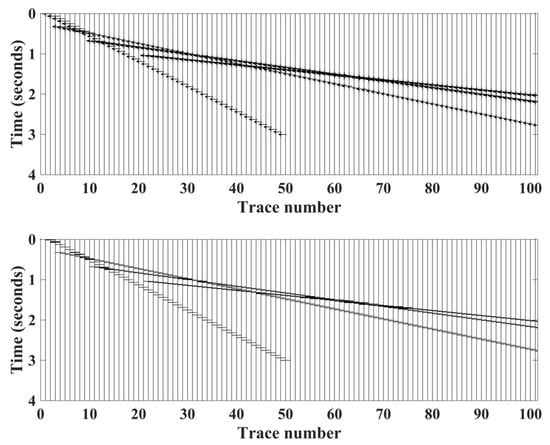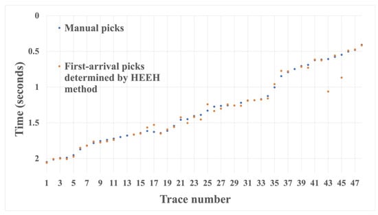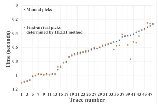 Furthermore, we calculated the percentage of the number of HEEH picks within 20 ms; the results are shown in Table 3. The chosen threshold value corresponds to accepting picks within half of a 40 ms typical wavelet period ([23,24]). The resulting accuracies for records 22 and 23 were 75% and 67%, respectively, despite a few unpickable traces and the generally low S/N for record 23. In general, the challenging nature of Yilmaz record 23 has been observed in previous studies, which reported considerable inaccuracies without extensive preprocessing. For example, Coppens’ picking method, which is based on energy ratios and their variations, resulted in an accuracy of only 37% within a 20 ms threshold. In comparison, Mousa et al. [23] achieved 41% accuracy after data enhancement using the τ–p transform method.