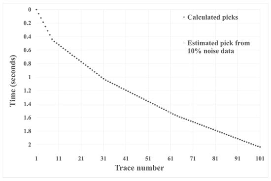 First arrival picks determined by the HEEH method and calculated from the model on synthetic data with 10% noise.