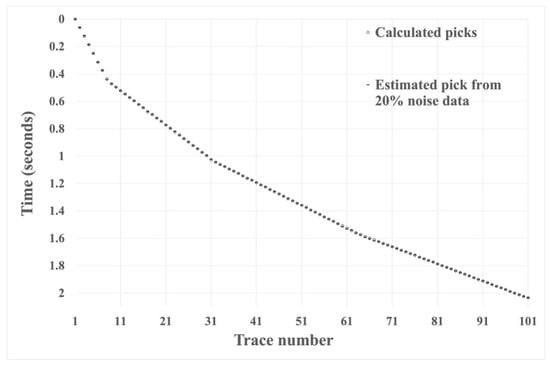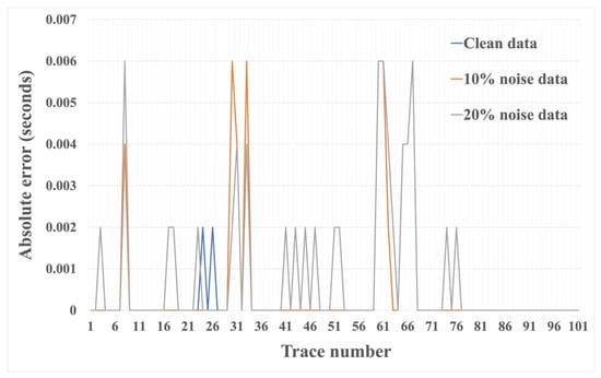We tested the effectiveness of the HEEH method using the absolute error, defined as the absolute difference between the manual pick and the HEEH generated pick. Absolute error tests have been used by many geoscientists (e.g., [20,21]). Figure 6, Figure 7 and Figure 8 show the first arrival picks from the HEEH method versus those calculated from the model for the clean, 10% noise-contaminated, and 20% noise-contaminated synthetic data sets. Despite the increasing amount of noise, the HEEH and calculated picks exhibit an excellent match. Table 1 summarizes the basic statistical parameters of the absolute errors of the synthetic dataset, which show a median absolute error of 0 ms for all datasets, indicating excellent performance. For comparison, Figure 9 shows the absolute errors of all tested synthetic datasets.